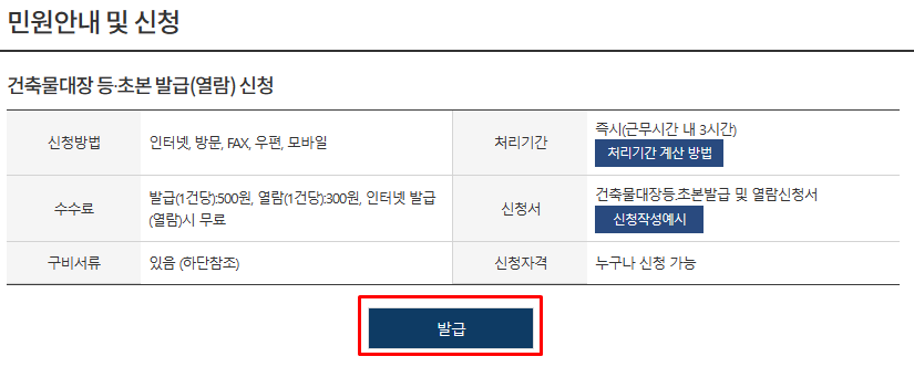 - 수수료 : 발급:500원, 열람:300원, 인터넷 발급(열람)시 무료