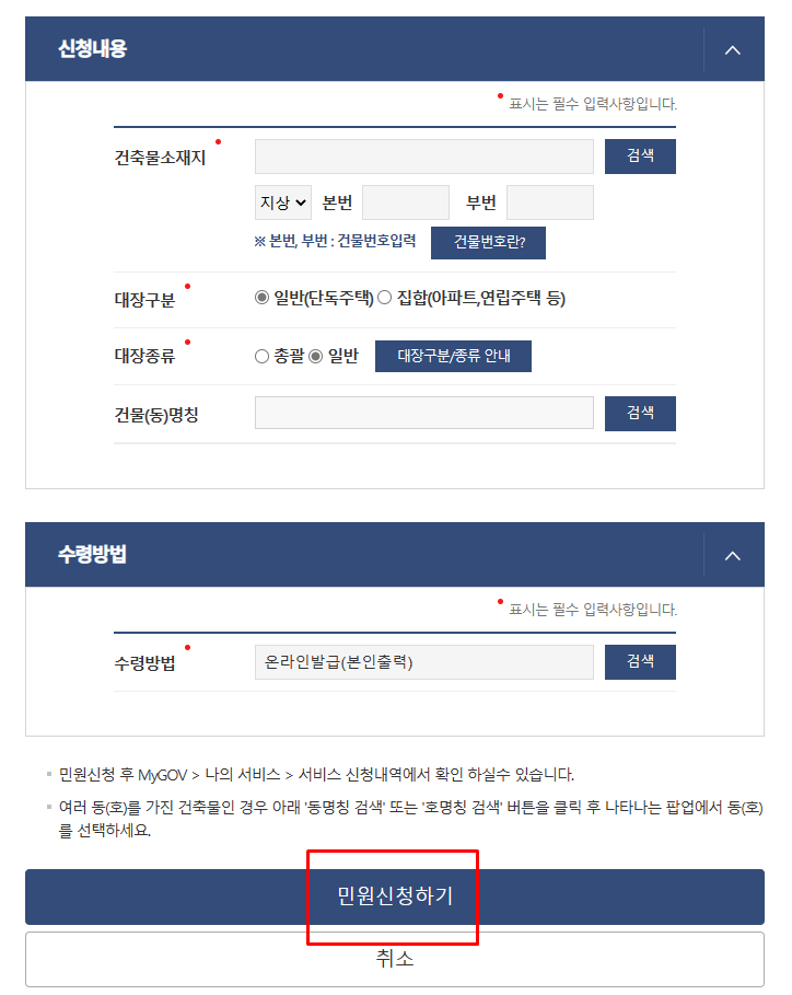 건축물소재지, 대장구분, 대장종류, 건물(동)명칭에 원하는 정보를 입력합니다. 수령방법으로 온라인발급(본인출력)이 기본적으로 설정되어 있습니다. 해당 내용들을 모두 기입했다면 하단에 있는 '민원신청하기'를 선택하시면 됩니다.