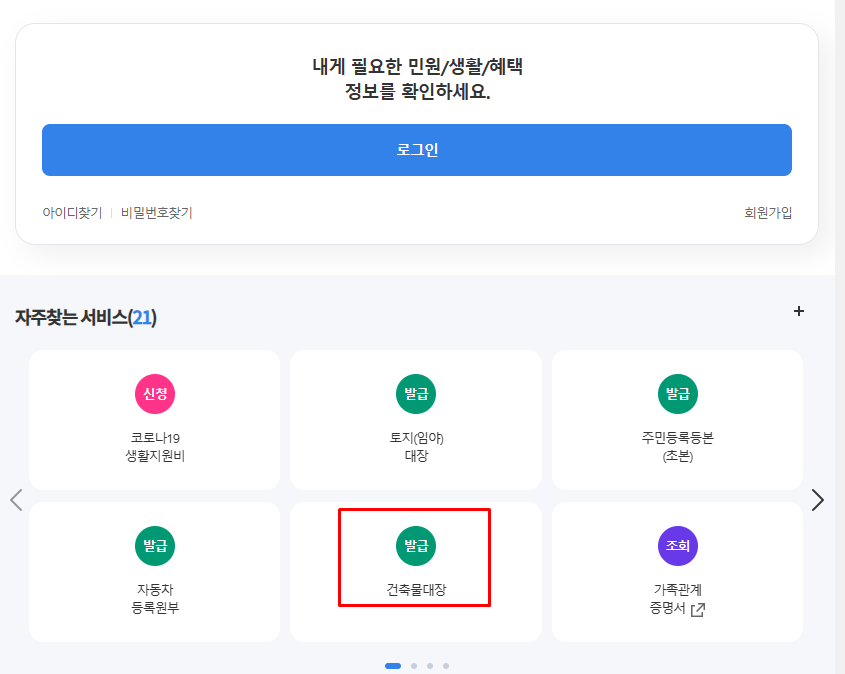 위 사진에서 보이는 것과 같이 홈페이지 메인 페이지를 확인하시면 [건축물대장] 서비스를 바로 이용할 수 있습니다. 화면크기가 달라 차이를 보인다면, 정부24 홈페이지 검색기능을 이용해 '건축물대장'을 검색하여 사용할 수 있습니다.