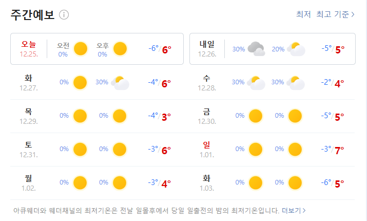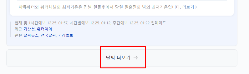 1번에서는 현재의 날씨 정보를 네이버에서 확인하는 방법을 찾아봤습니다. 이제는 과거 날씨 정보를 찾는 방법을 살펴볼게요. 1번에서 보여지는 화면 하단에 있는 '날씨 더보기'를 통해 확인할 수 있습니다.
