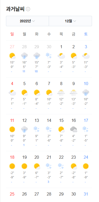 위 사진과 같이 보여지는 부분입니다. 화면 크기에 따라 차이를 보일 수 있습니다. 2022년과 12월로 되어있는 부분을 조절하시면 과거의 날씨를 보실 수 있습니다. 대략 최대 5년전의 과거 데이터를 보시는데 도움이 될 것입니다.
