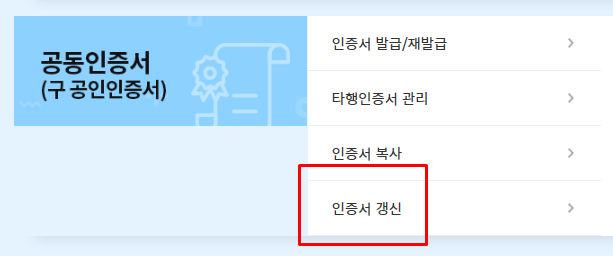 위 사진에서도 확인할 수 있습니다. '인증서 갱신'이라는 부분이 있죠. 해당 기능을 이용해서 인정서 갱신을 진행할 수 있습니다. 아래에 다시 한번 사진을 첨부하도록 하겠습니다. 메뉴를 선택해 주세요.