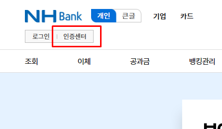 농협 홈페이지를 보시면 여러 메뉴가 보입니다. 이 중에서 '인증센터'라는 메뉴를 선택합니다. 공인인증서에 관련된 다양한 서비스가 모여있는 카테고리라 생각할 수 있습니다. 여기로 이동합니다. 위치는 사진을 참고해 주세요.