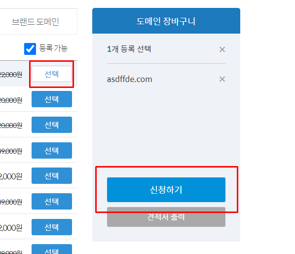 여러 도매인 중 마음에 드는 주소를 선택합니다. '선택'버튼을 클릭하면 되며, 도메인 장바구니에 표시되게 됩니다.