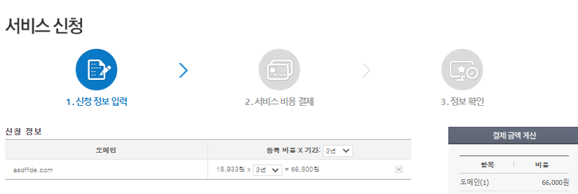 신청하여 결제하는 과정에서 주의할 부분은 사용기간에 따른 도매인 등록비용을 확인하는 것이라 할 수 있습니다. 위의 오른쪽 사진을 보시면 기본 3년으로 되어 있는 것을 알 수 있습니다. 비용은 66,000원으로 뜨네요. 소유자 정보, 관리자 정보, 부가서비스 추가, 동시 신청 가능 서비스, 약관동의 등의 사항을 조정하시면 최종 구입으로 넘어갈 수 있습니다.