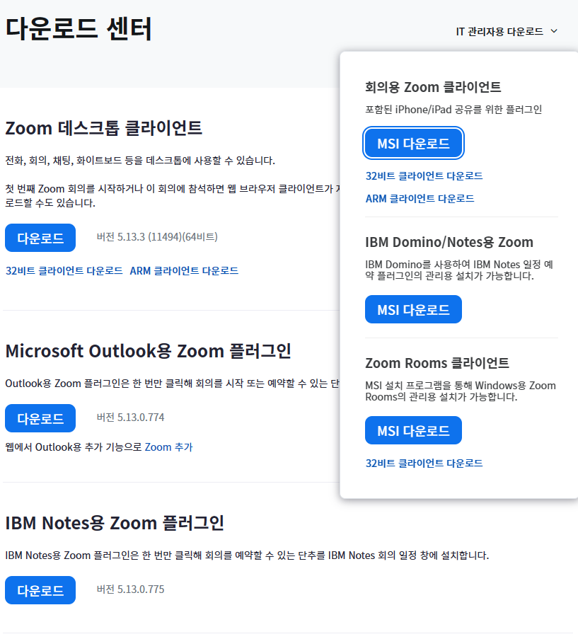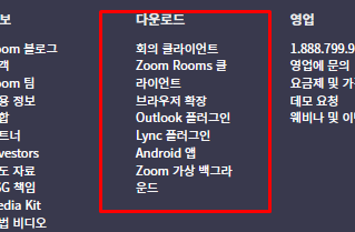 줌 공식 사이트에서 다운로드를 진행할 수 있습니다. 메인 페이지 하단에 보면 줌 다운로드 센터로 갈 수 있는 링크가 있습니다. 해당 링크를 선택하면 플랫폼에 맞는 프로그램을 선택적으로 다운로드 할 수 있습니다.