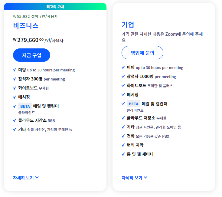 요금제의 종류는 '무료', '프로', '비즈니스', '기업'의 상품군으로 구분되어 있습니다. 가장 큰 차이는 참석자와 클라우더 저상소 및 기타 기능의 지원에 있다고 할 수 있습니다. 사용하려는 규모를 미리 확인하는 것으로 차후 발생될지 모를 문제점을 미연에 방지할 수 있을 것입니다. 관련 내용은 아래 사진을 참조해주세요.