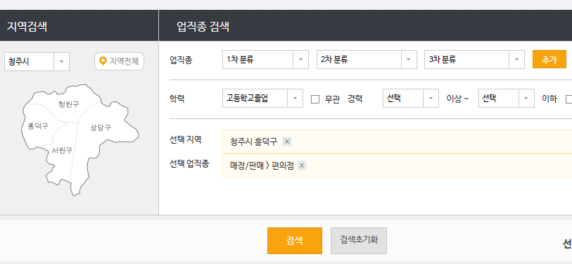 예시로 홍덕구와 직종, 학력을 선택하여 검색했습니다.