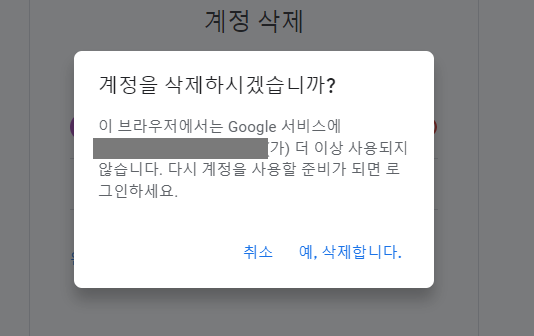 앞에서 언급한 내용의 마지막 단계죠. 계정 삭제를 진행할 수 있습니다. 등록된 계정 오른편에 보시면 -로 표시된 부분이 있습니다. 해당 메뉴를 선택하면 하나의 팝업창이 뜹니다. '계정을 삭제하시겠습니까?'라는 안내 메시지를 확인할 수 있습니다. 여기서 '예, 삭제합니다.'를 선택하면 마무리가 됩니다.