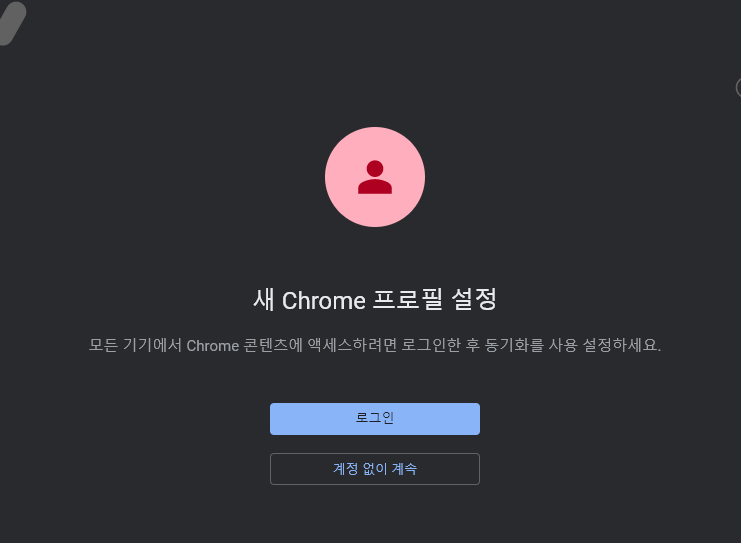 크롬 프로필을 등록하기 위한 첫번째 선택지라고 할 수 있습니다. 구글 계정을 이용하는 경우와 로그인 없이, 다시 말해 게정 없이 프로필을 등록하는 기능을 의미합니다. 어떤 것을 선택해도 크게 상관은 없습니다. 원하는 것으로 진행합니다. 굳이 계정이 필요하지 않다면 '계정 없이 계속'을 선택하는 것이 편리할 수 있습니다.