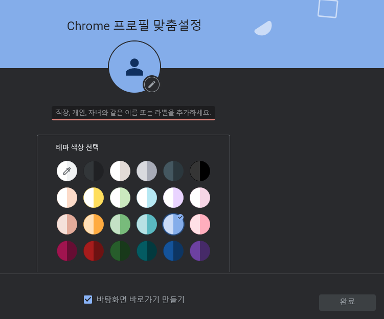 마지막으로 프로필 이름과 테마 색상을 선택하면 끝입니다. 자신이 알기 쉬운 프로필 이름을 선택하시면 됩니다. 또한, 테마 색상은 필요하지 않다면 기본으로 선택된 내용을 이용하는 것이 편리할 수 있습니다. '완료'를 선택하면 해당 프로필로 크롬이 실행되며, 바탕화면에 바로가기가 등록되는 것을 확인할 수 있습니다.